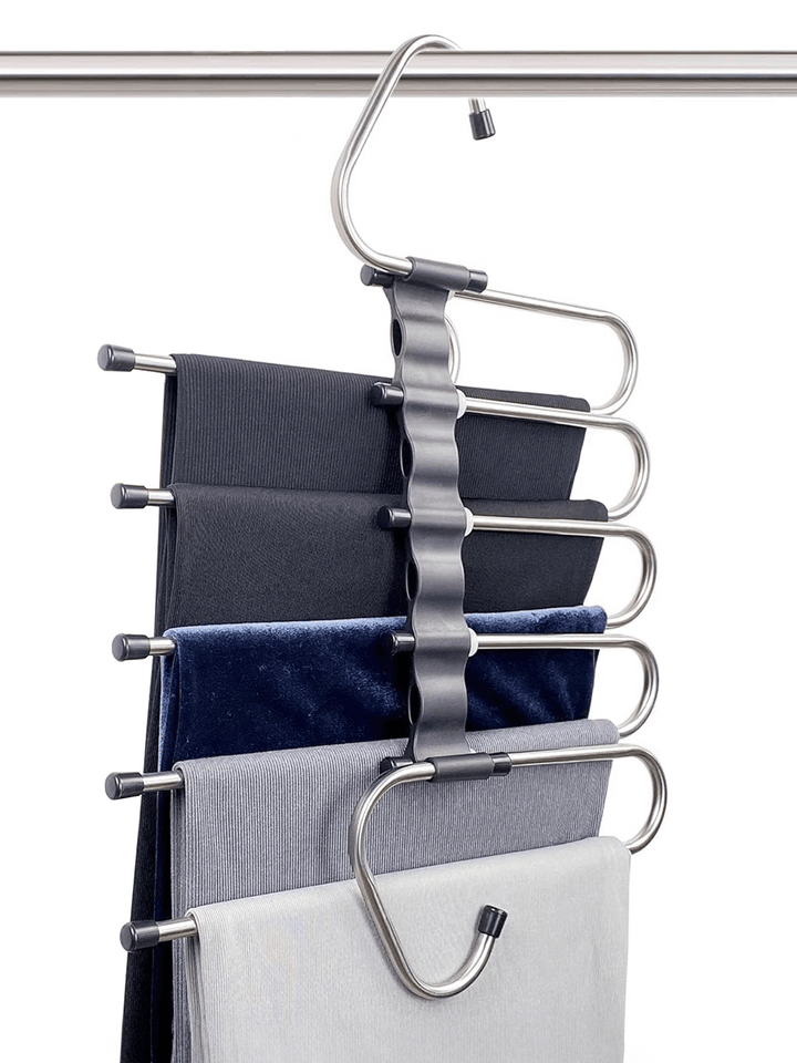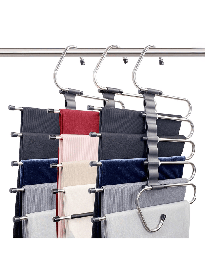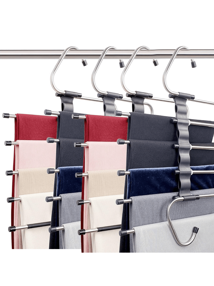 - SPACE SAVING: Each 5 in 1 hanger can hold up to 5 slacks or jeans at same time. Unique design will save at least 80% of space and keep your wardrobe clean well organized. Hanger for clothes hanging keep trousers in natural shape without any wrinkle, making them compact and organized.