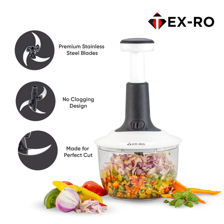 - Super-sharp stainless steel blades are placed at different levels in such a way that they cover the entire height of the chopper, and manage to chop very easily in seconds.